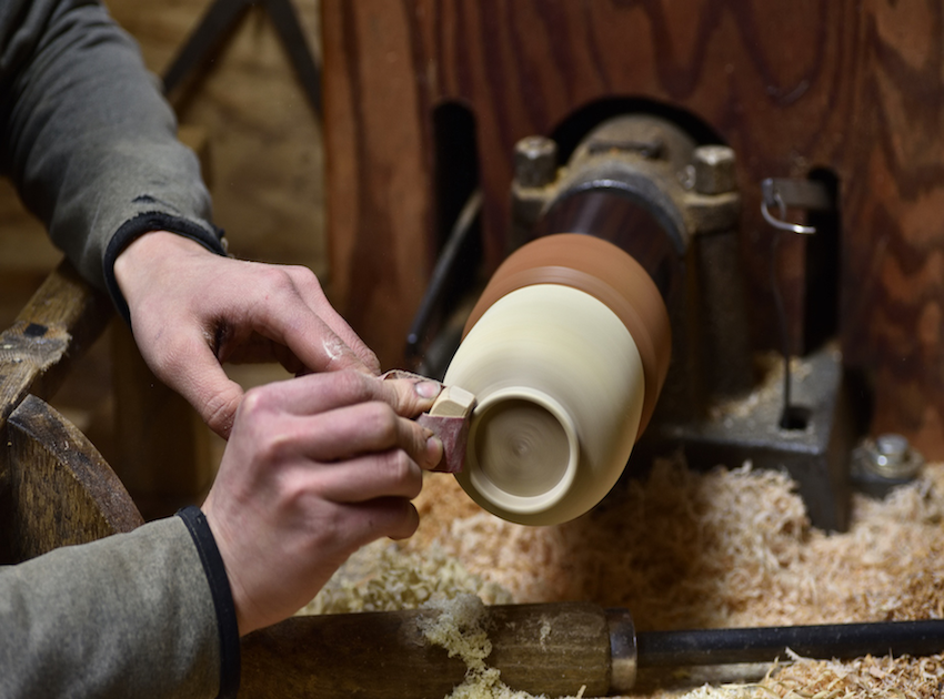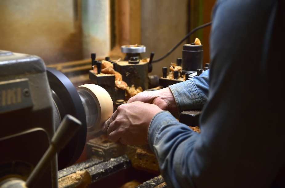 山中漆器を支えてきたのが、器のかたちを生み出す木地師の存在です。木を高速で回転させながら刃物を当てて削り出す木地挽きは、経験と感覚がものを言う仕事。木が育つ方向に逆らわず木取りする「縦木取り」により、歪みにくく堅牢でありながら、薄挽きや蓋物といった繊細な造形が可能になります。木目を活かした自然な風合いを引き出す、山中塗の美しさを支える土台となる工程を間近で体感します。