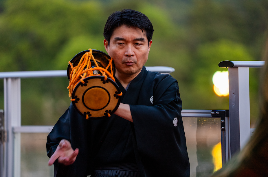 瀬戸内に夜の帳が降り、世界遺産嚴島神社が灯りに照らされて 夜闇に浮かび上がる頃、いよいよ能楽演舞が始まります。 洋上だからこそもたらされる静謐な空間に、 鼓の音色と謡の声が神秘的に響き渡ります。 舞われる演目も嚴島神社に関係した武将の物語。 夜の闇に幻想的に浮かび上がる嚴島神社を借景にした鑑賞は 言葉では言い表せない程の感激と感動を皆様にもたらすことでしょう。 唯一無二の能楽体験をお楽しみくださいませ。