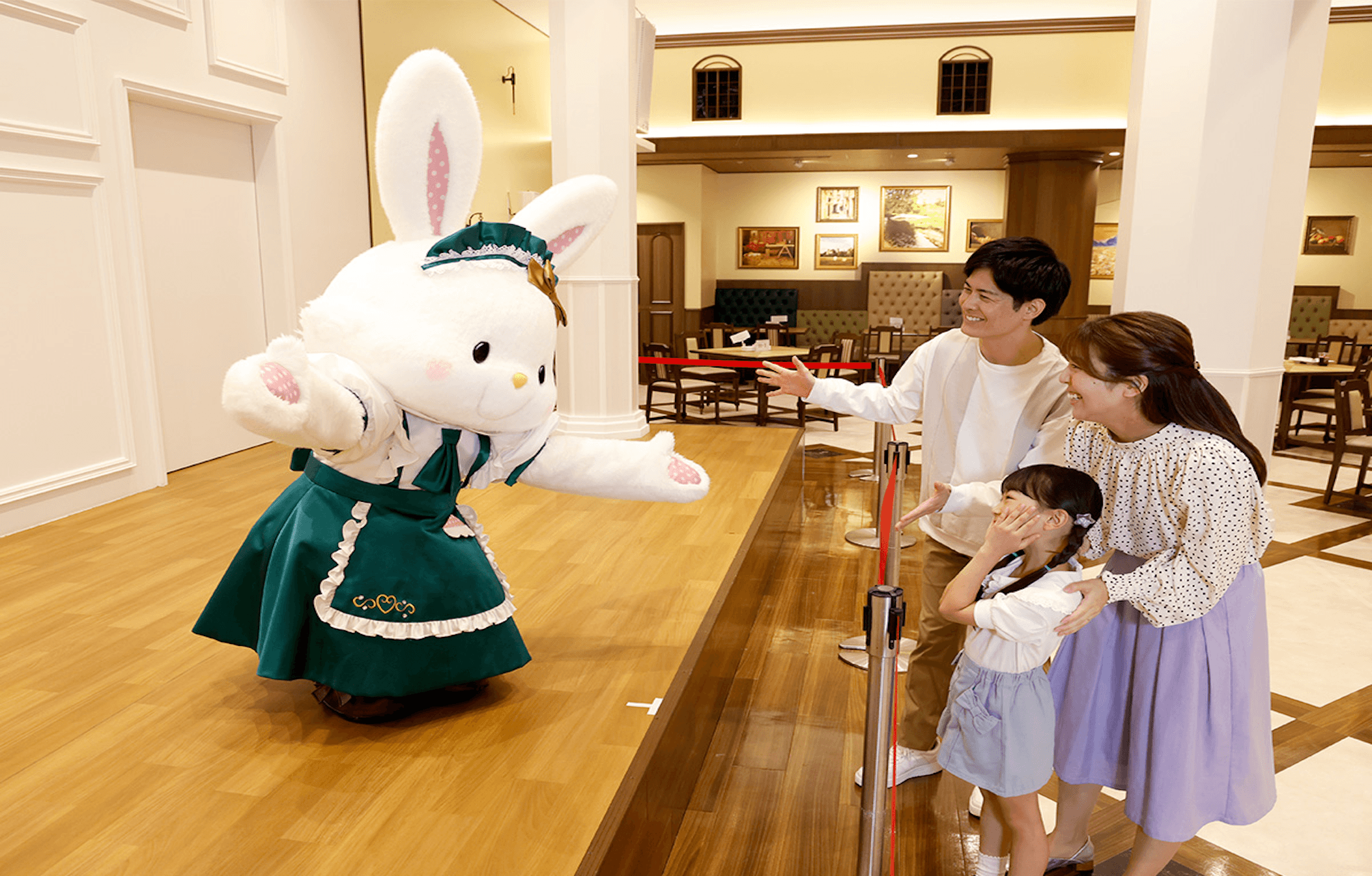 キャラクターたちが彩るステージを間近に、ビュッフェランチ。お食事を楽しみながら、登場するキャラクターの姿を自由に写真へ残せます。