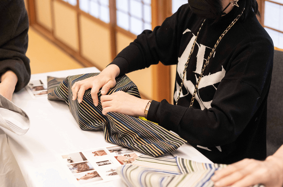 本プランでは、この小倉織の魅力に深く触れていただくべく、通常立ち入り困難な機械織工場を特別に訪問。ガラス張りのラボのような織物工場とそこで作業する職人の様子を解説付きでご見学いただく。工場見学後は、小倉縞縞本店にて小倉織を使った風呂敷ワークショップを実施。風呂敷の歴史や小倉織の特長を聞きつつ、折りや結びによって生み出される小倉織風呂敷の様々な表情をお楽しみいただく。